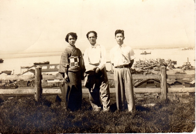 北海道で撮影された記念写真. この写真は次女のれい子さんが保管されていました. 後方には釧路港でしょうか, 海が見えています. 写真の裏には, 本人により「昭和27年(1952)9月3日, 北海道釧路にて, 明治鉱業会社社員, 西野氏の案内で」と記されています. 中央が大森明恍本人, 左は日出子夫人, 右は明治鉱業の西野さんという方ではないかと思われます.