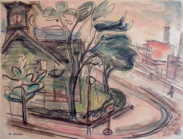 6 o’clock at Sapporo Clock Tower, watercolor on paper, Sept., 1952.