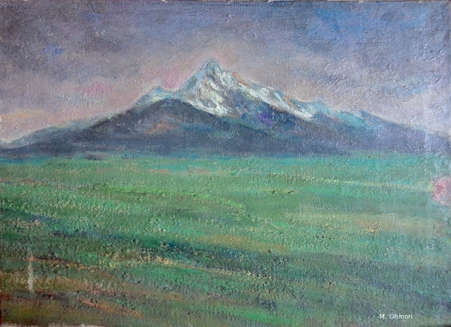 キャンバスの木枠に本人により「斜里岳 大森明恍」と記されています. K#112とほぼ同じ構図ですが, 山の頂にはすでに雪が積もっています.