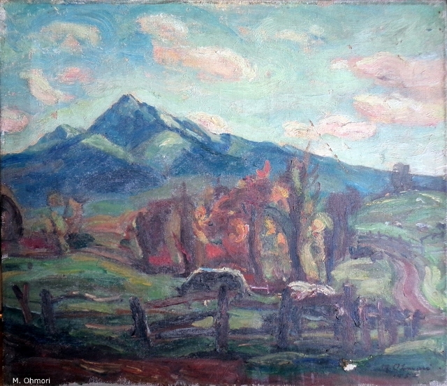 画面右下に「M. Ohmori 1952」、またキャンバスの木枠には本人により斜里岳(三井農場) 大森明恍画
