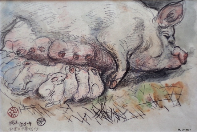 左下に「1952 Oct-4 (明)」(桃)の落款. 鉛筆で「斜里三井農場ニテ」と記されています. また紙の裏の左下「(173) 1952 10/4 斜里三井農場にニテ 豚の愛情 」と記されています.