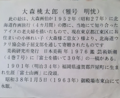 大森明恍の没後, 平成12年(2000年), 次女のれい子さんが, 北海道のウタリ協会弟子屈支部を通じて, 弟子屈町屈斜路コタンアイヌ民俗資料館に, 北海道滞在中に屈斜路コタンの人々を描いた油彩画1点, スケッチ6点を寄贈しました. 写真中央の油彩画に描かれている男女は, 当初, アイヌの老夫婦を描いたものと思われていましたが, その後 アイヌ文化振興財団の岩谷光男氏の調査により, 夫婦ではなく, 男性は山中酉蔵さん, 女性は弟子豊治さんの叔母さん(ともに故人)と判明したそうです.