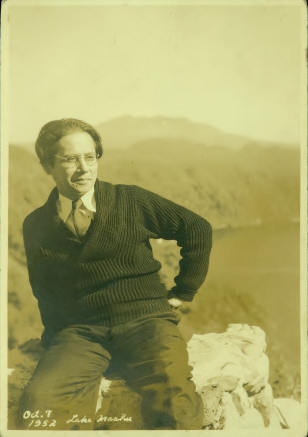大森明恍の摩周湖での記念写真. 写真左下に”Oct. 7 1952 Lake Mashu”とあります. 作品K#65の制作と同時期に撮影したものと思われます.
